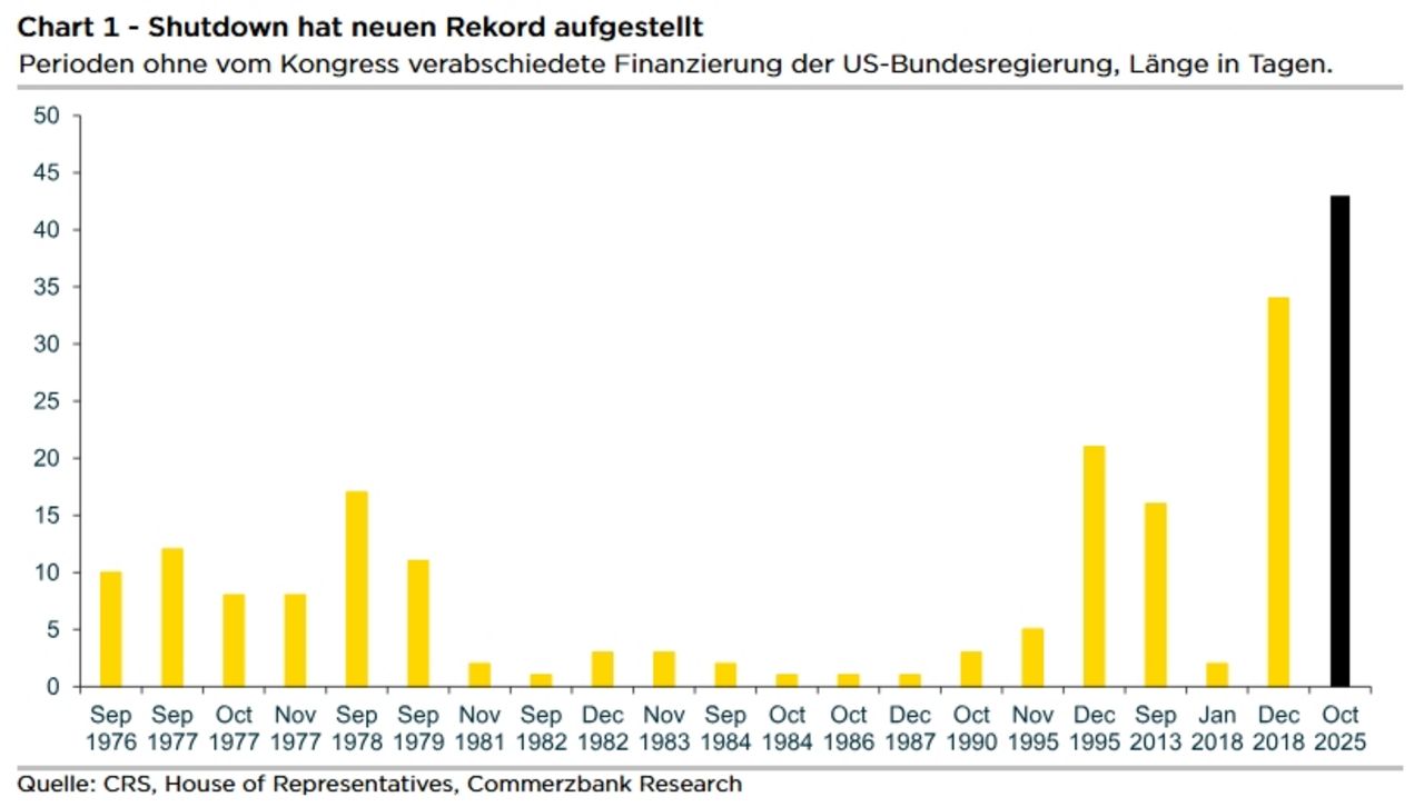Rund 1,4 Millionen Bundesbedienstete sind von der Rekord-Schließung der US-Regierung betroffen, wobei 730.000 ohne Bezahlung arbeiten und 670.000 beurlaubt wurden. Ein Teil der Regierungsmitarbeiter wurde als systemrelevant eingestuft – sie arbeiten ohne Bezahlung weiter, etwa Fluglotsen. Viele Beschäftigte melden sich jedoch krank, um mit Nebenjobs Geld zu verdienen. Etliche Ämter etwa bei der US-Steuerbehörde sind unterbesetzt, denn die Hälfte der Mitarbeiter ist beurlaubt.